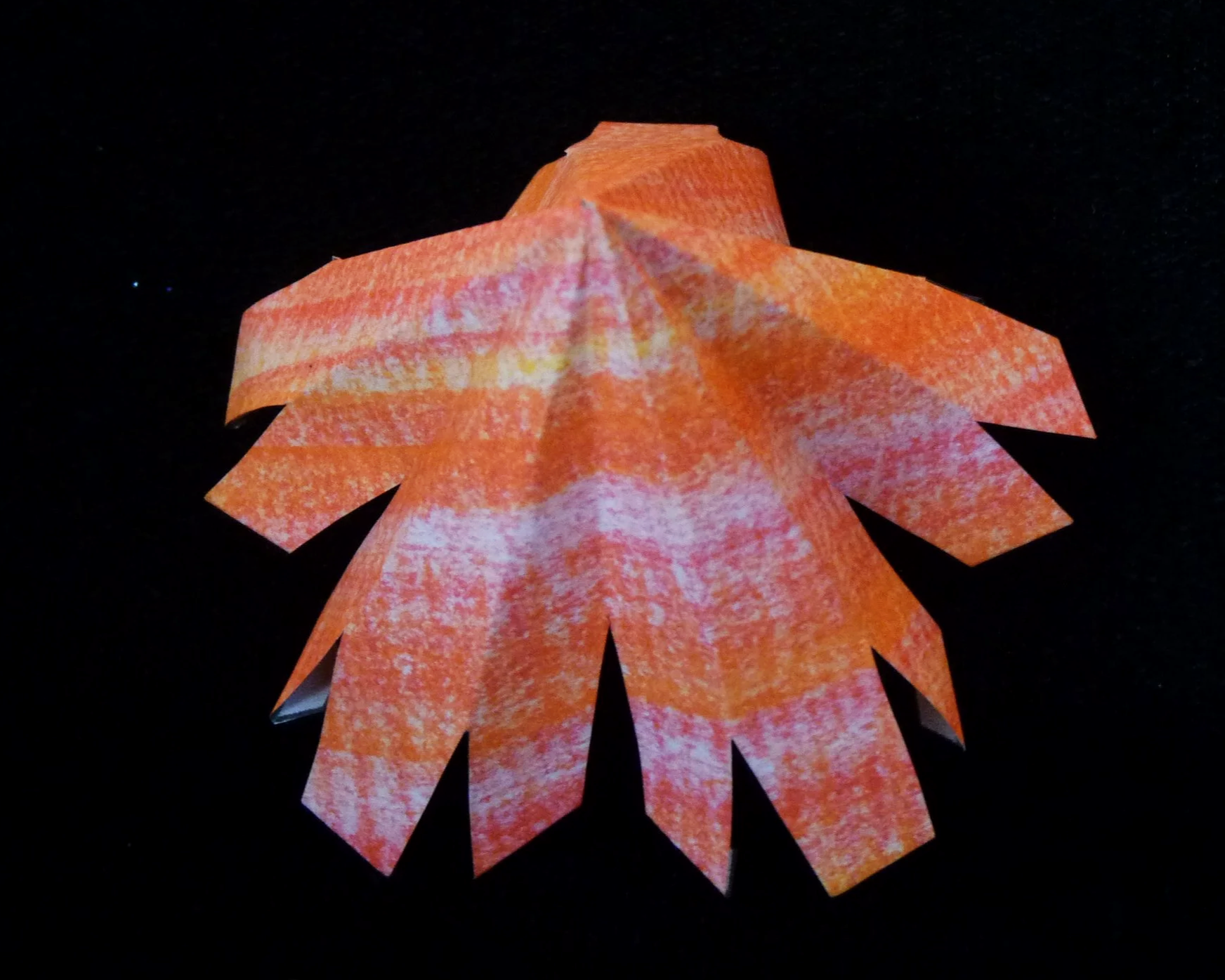 Connect the tenth part to the project with three glue flaps to the second part, three glue flaps to the third part, and three glue flaps to the seventh part. Connect the eleventh part to the project with three glue flaps to the seventh part, three glue flaps to the eighth part, three glue flaps to the ninth part, and three glue flaps to the tenth part. Connect the twelfth and final part with three glue flaps to the ninth part, three glue flaps to the tenth part, three glue flaps to the third part, three glue flaps to the fifth part, and three glue flaps to the eleventh part.