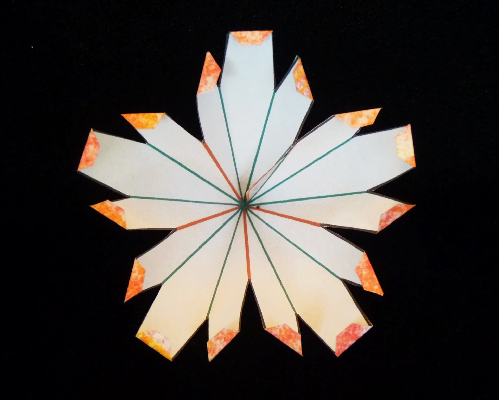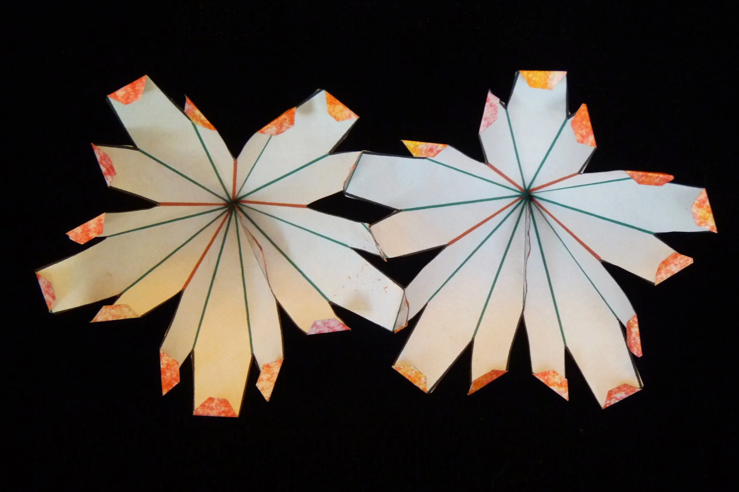 On all twelve parts, fold the green lines as valley folds and fold the red lines as mountain folds. On each part, glue one long flap to the other long flap.