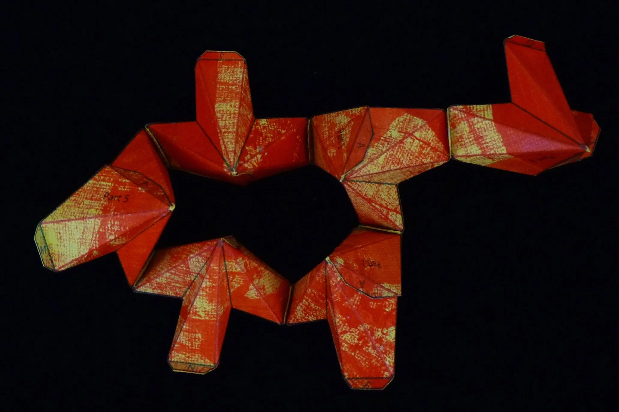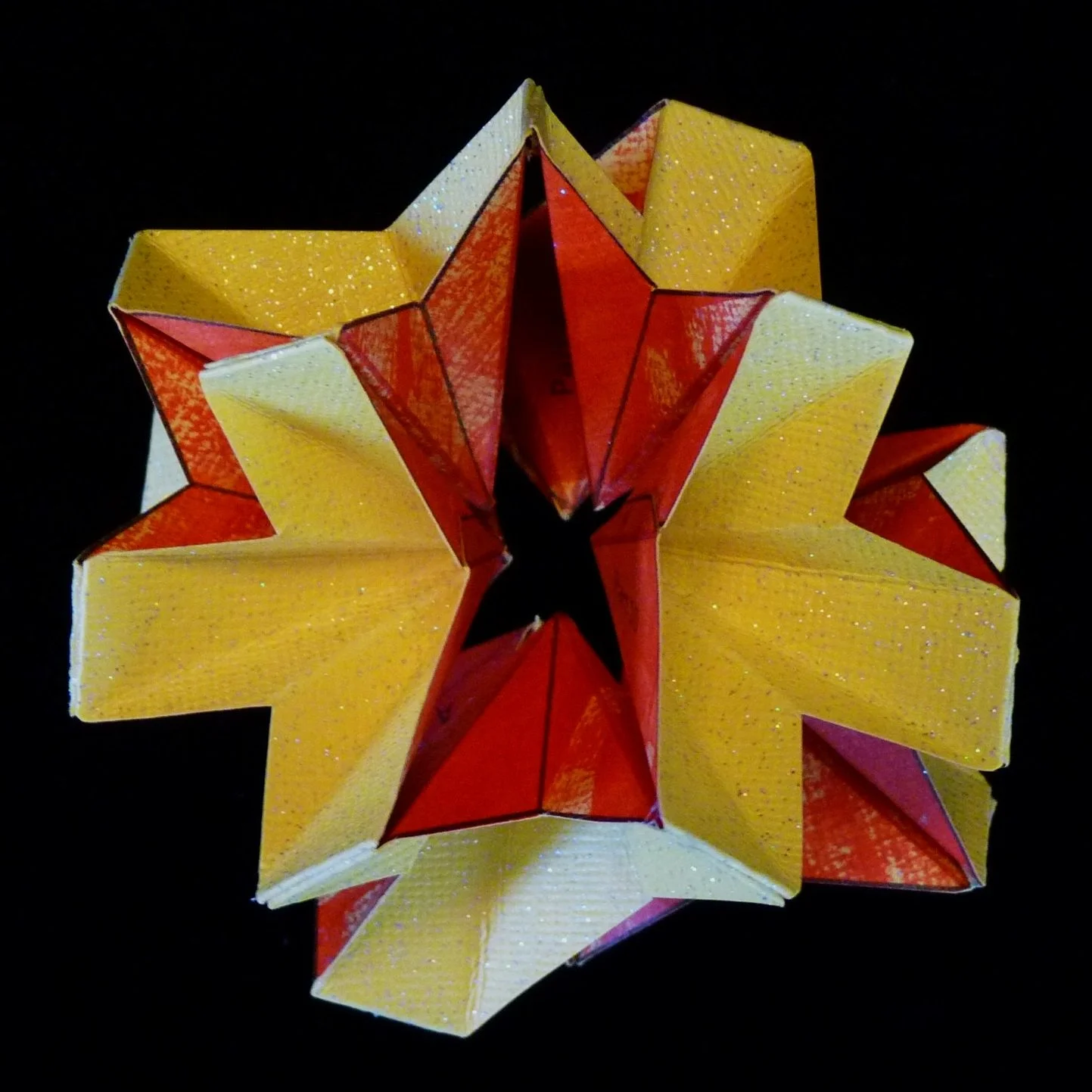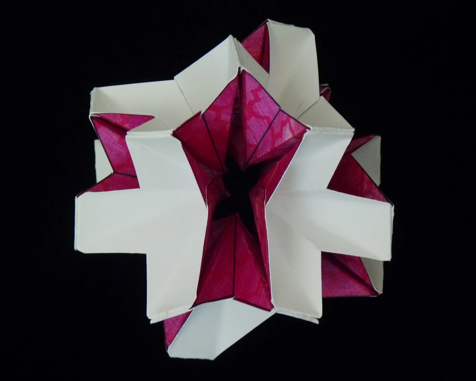 On all twelve parts, fold the green lines as valley folds and fold the red lines as mountain folds. On each part, glue Flap A to the checkered patch A.