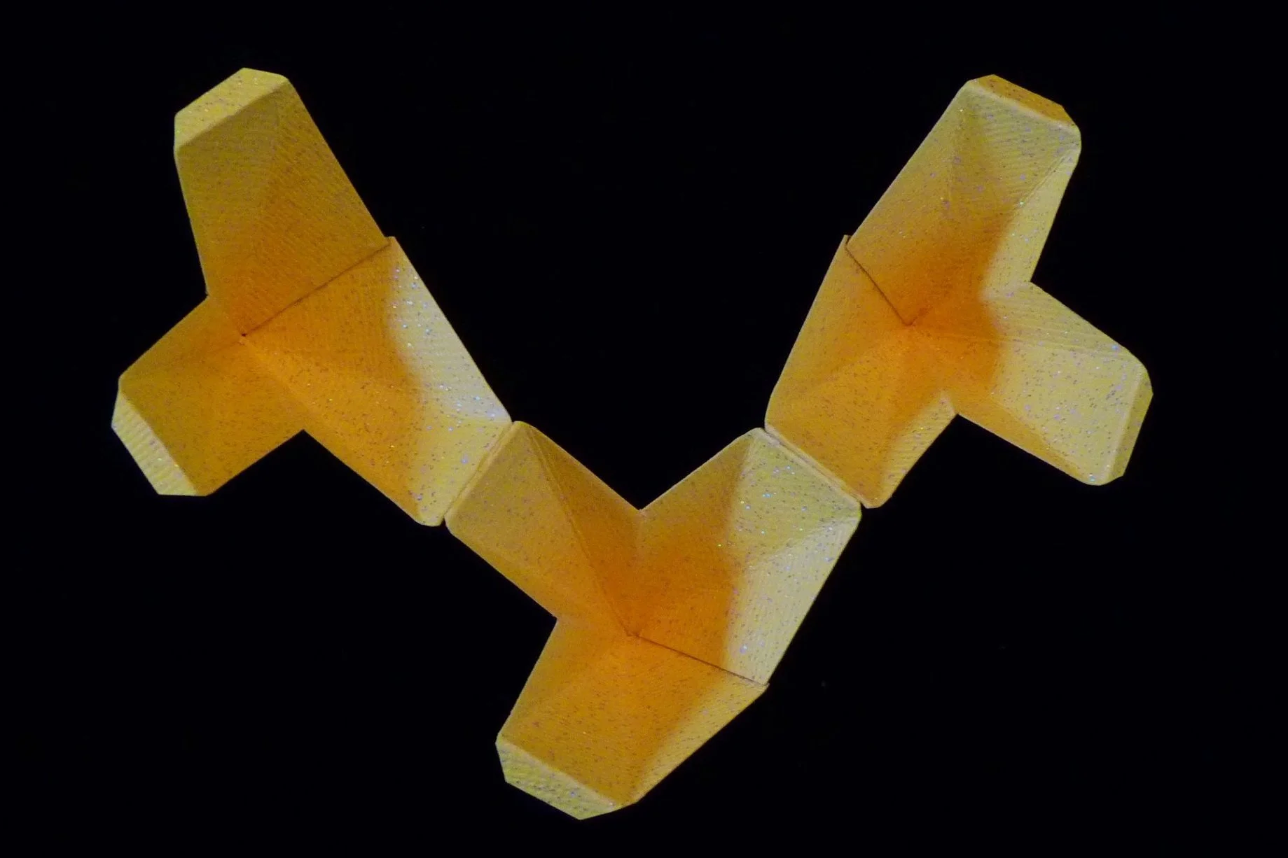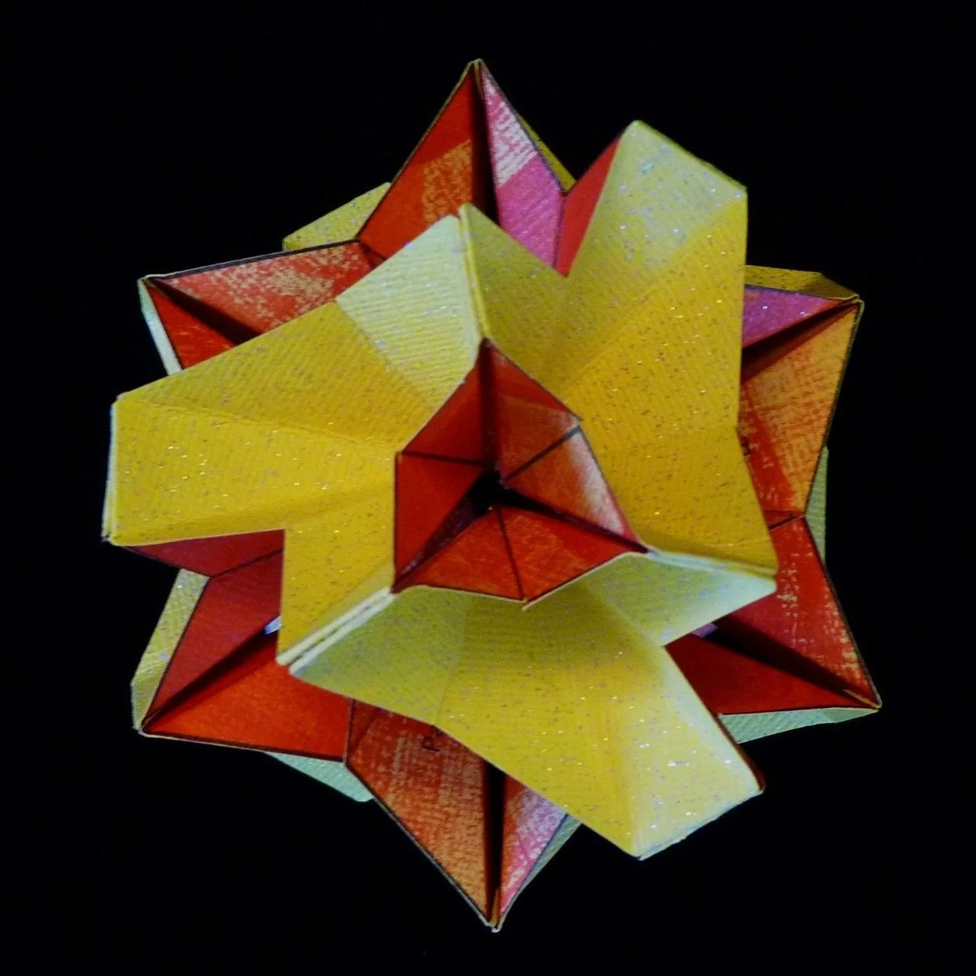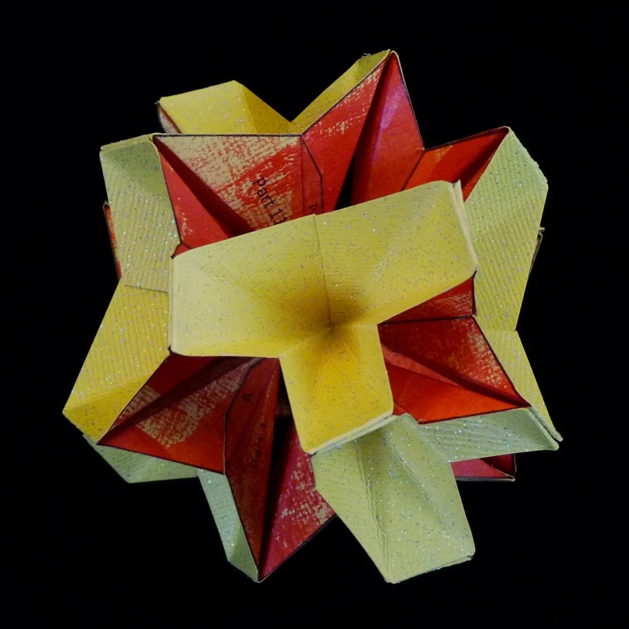 On all twelve parts, fold the green lines as valley folds and fold the red lines as mountain folds. On each part, glue Flap A to the checkered patch A.
