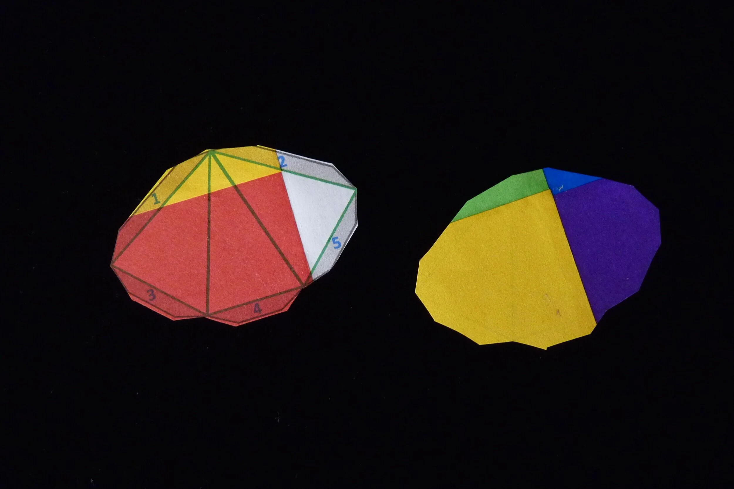 Arrange the four Part 1’s in a two by two arrangement so that a diamond is formed in the center. Attach by gluing one of the exterior face triangles on each Part 1 to the neighboring exterior face triangle on the adjacent Part 1.