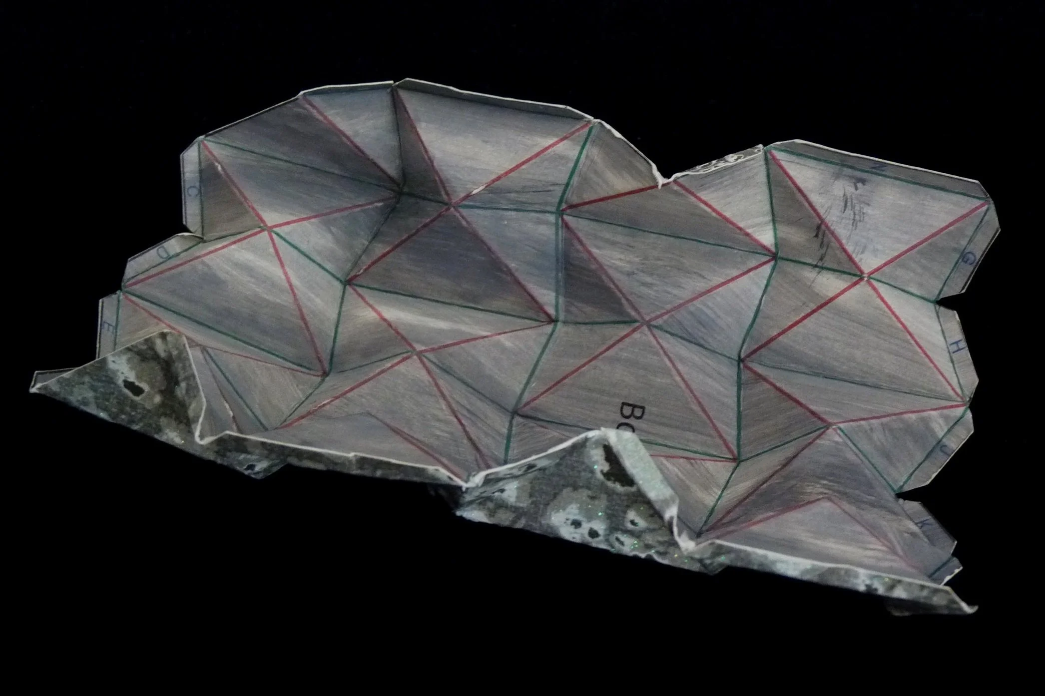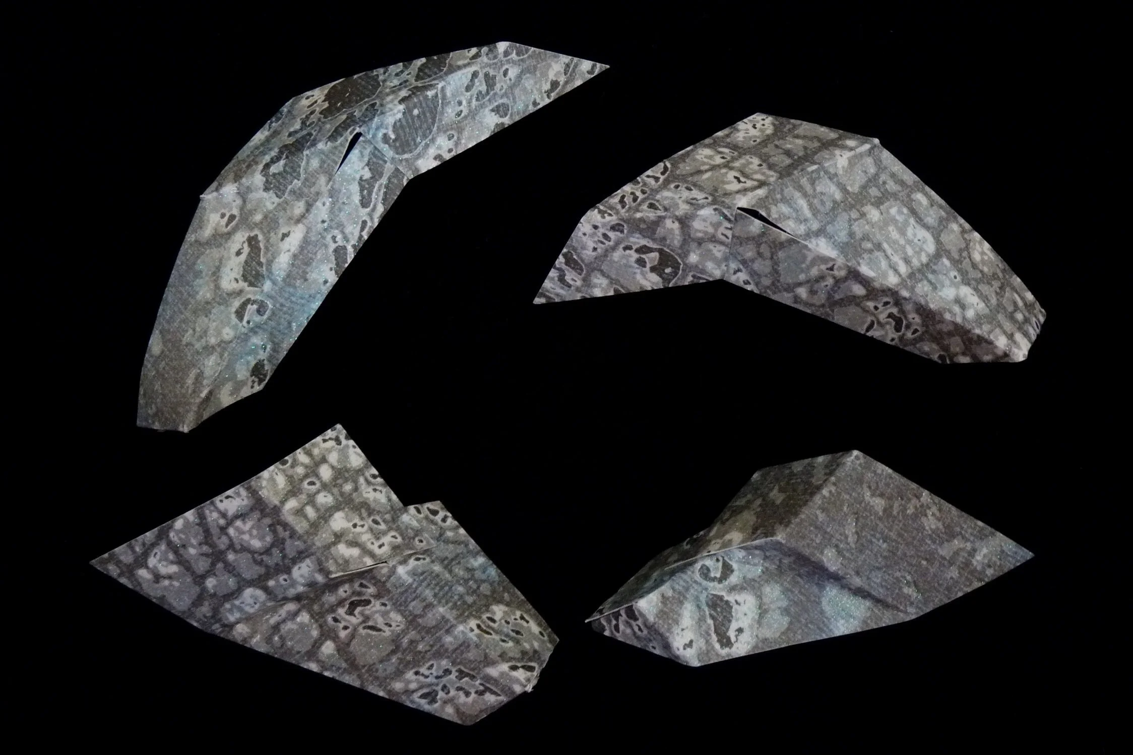 On the head and tail parts, fold all green lines as valley folds and all red lines as mountain folds. Use a similar process as you did for the body, that is, crease the green lines first, then crease red lines. Then gently collapse the part all at once so that all valley and mountain folds go in the correct directions. Glue Flap A to the other Flap A on the head part.
