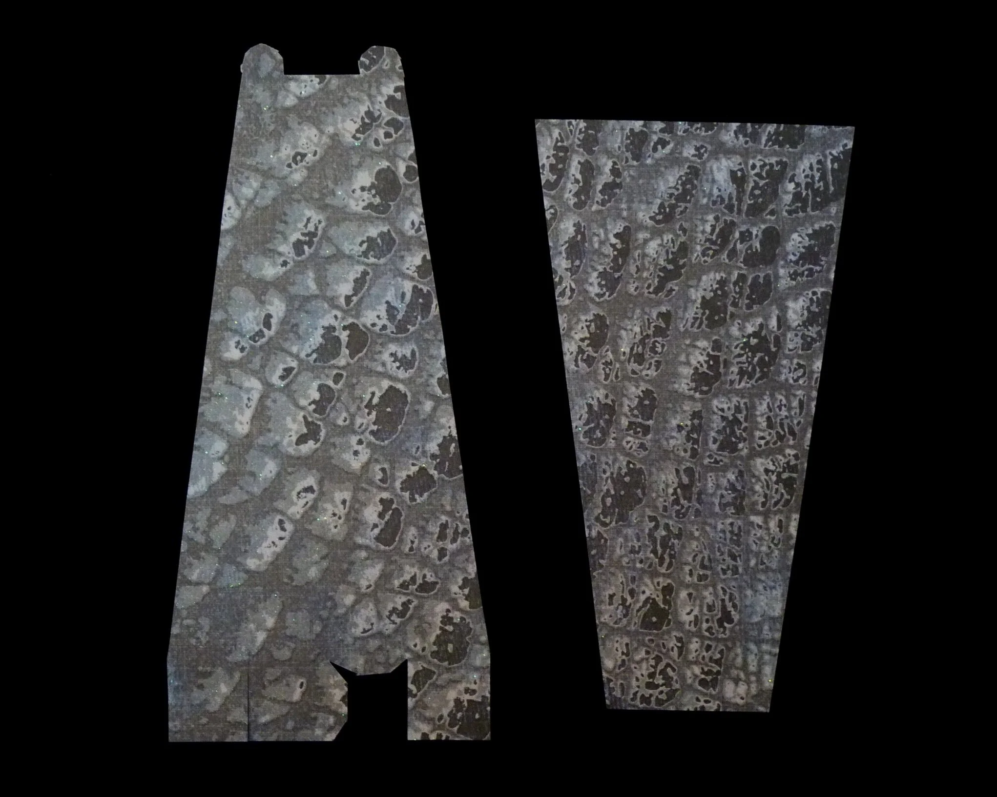 On each leg part, fold the green lines as valley folds and the red lines as mountain folds. On each leg, glue Flap B to the checkered Patch B. On each leg, glue the lower leg section behind the upper leg section so that the orange circle aligns with and covers the purple circle.