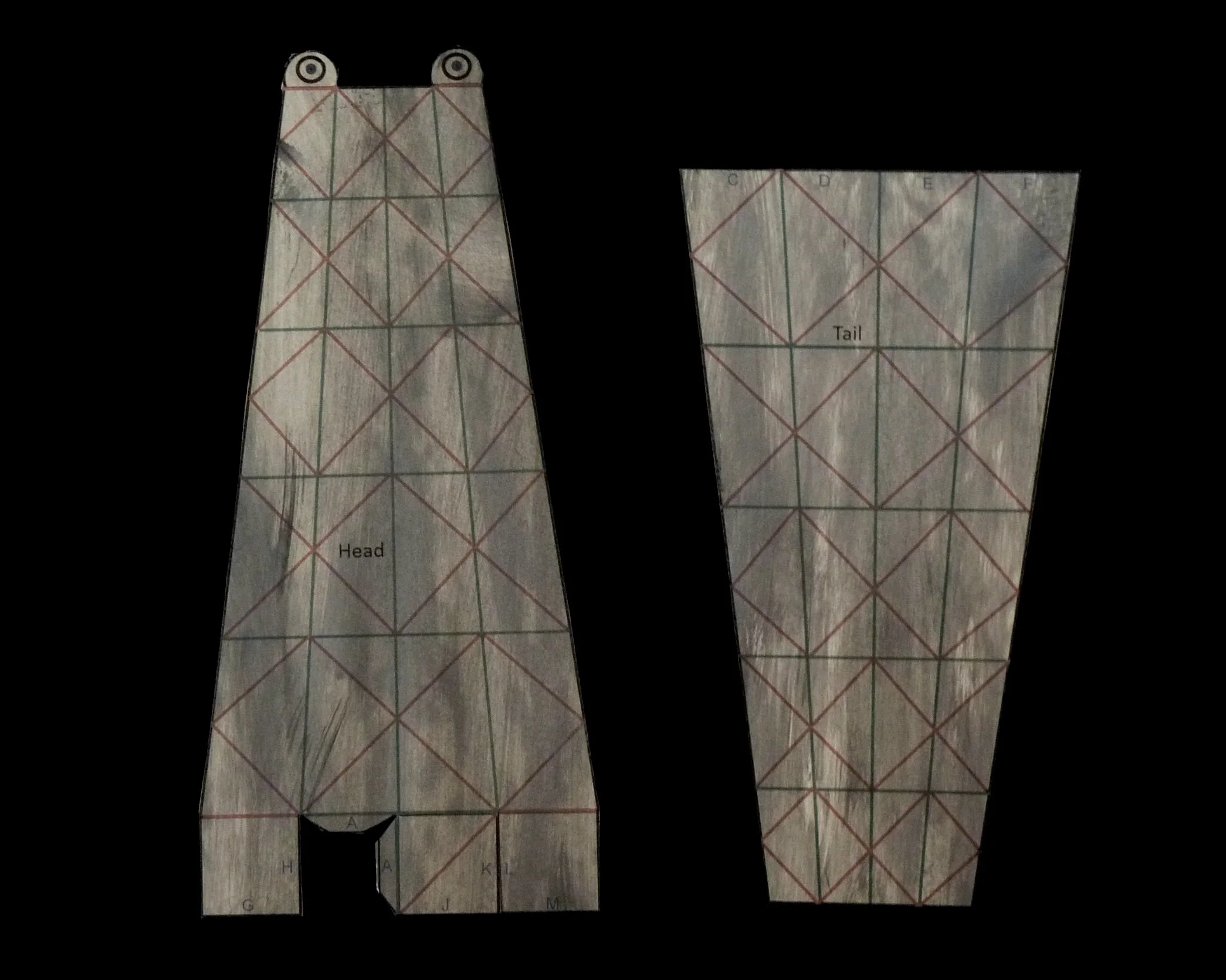 Cut out the head and tail parts by cutting on all black lines, including the one interior black line between squares on the head part.