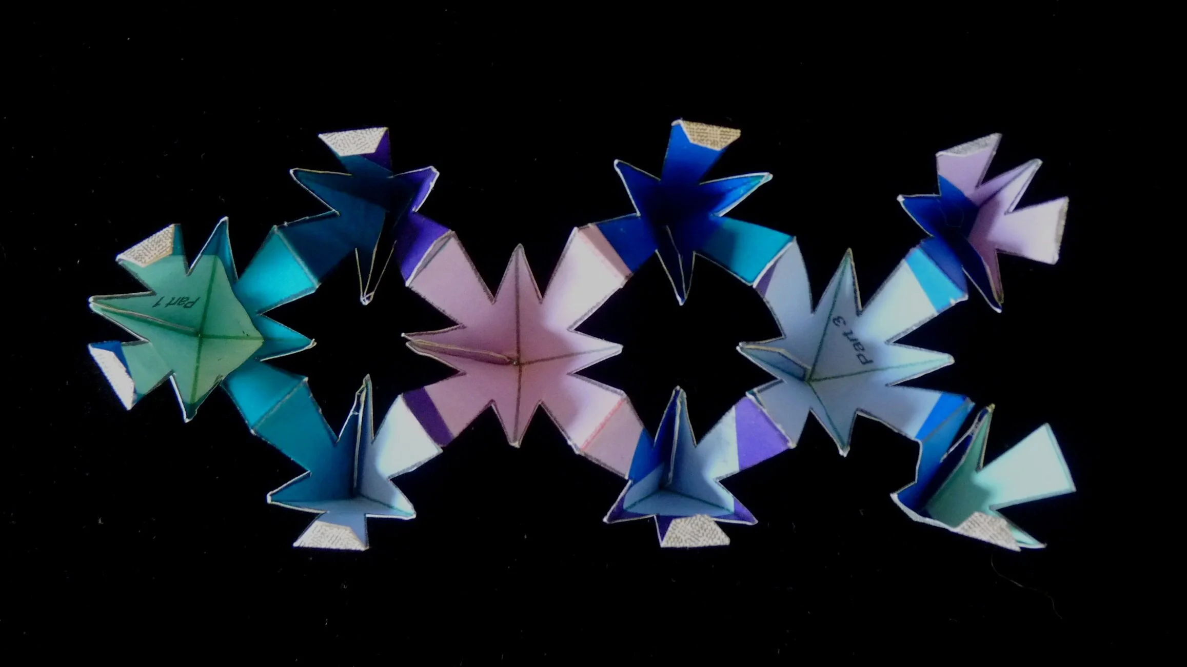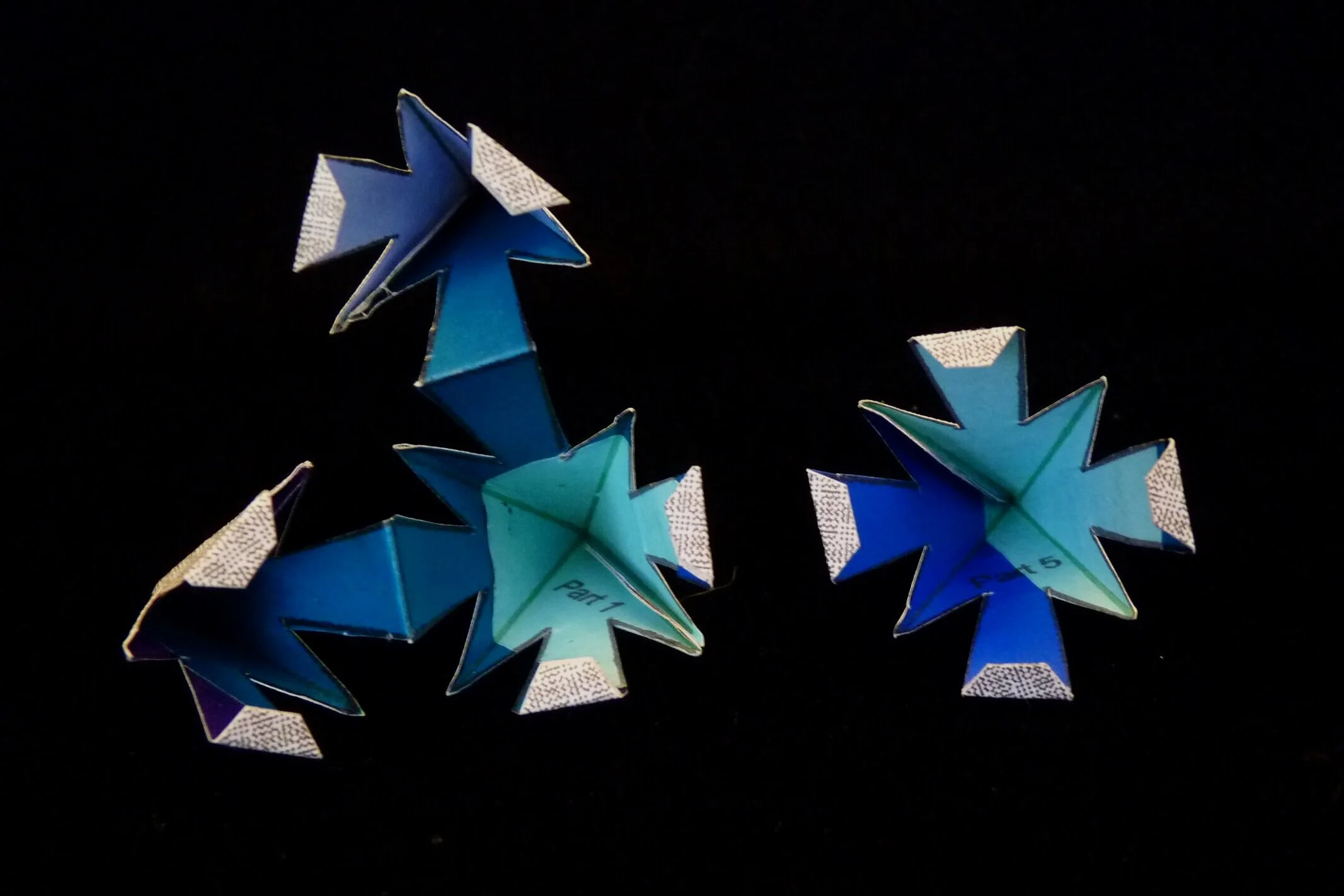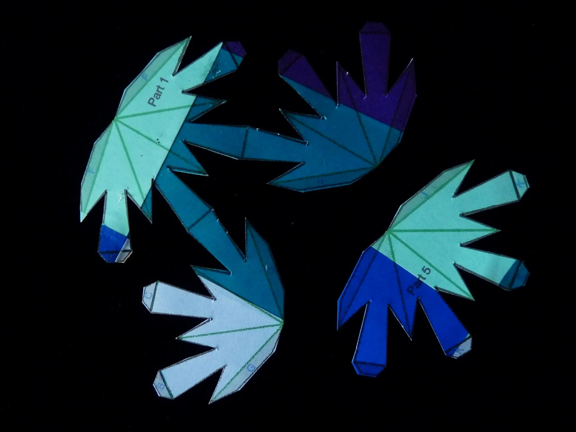 On each of the six pattern pieces, fold the green lines as valley folds. On Parts 1, 2, 3, and 4, fold the red lines as mountain folds.