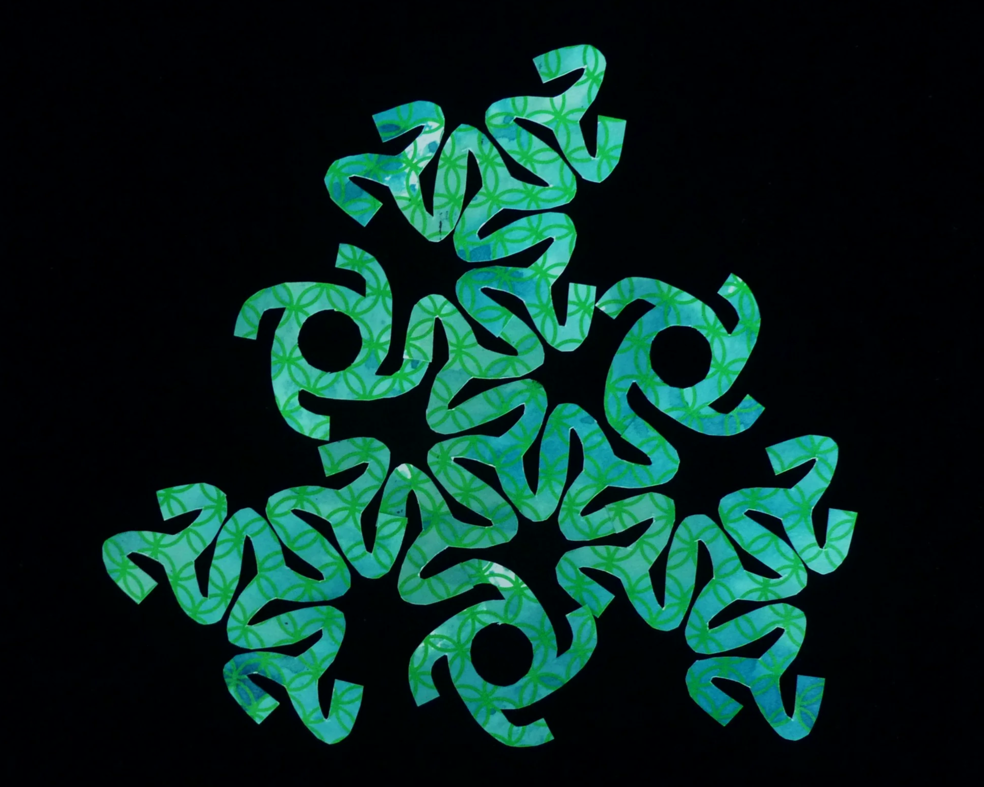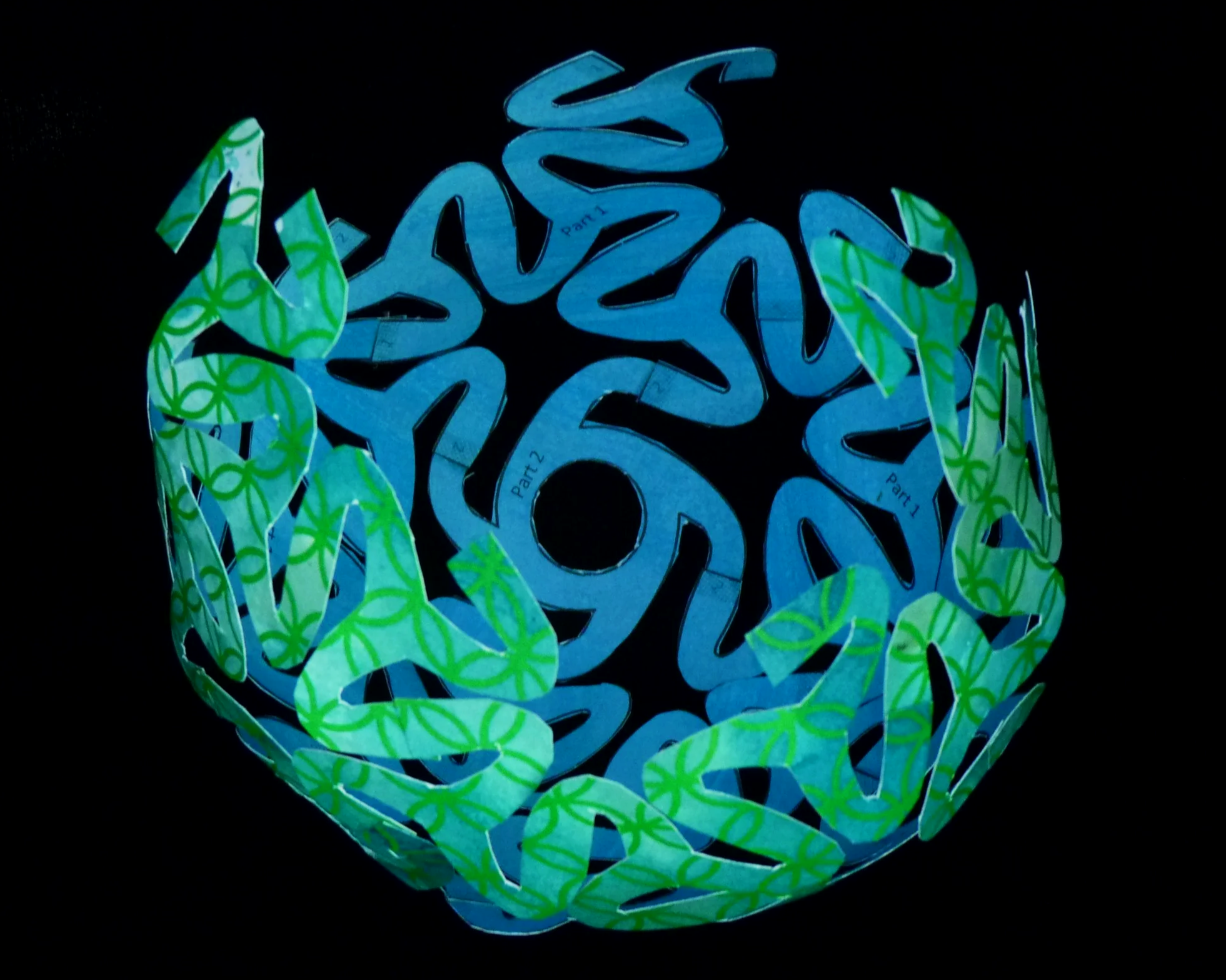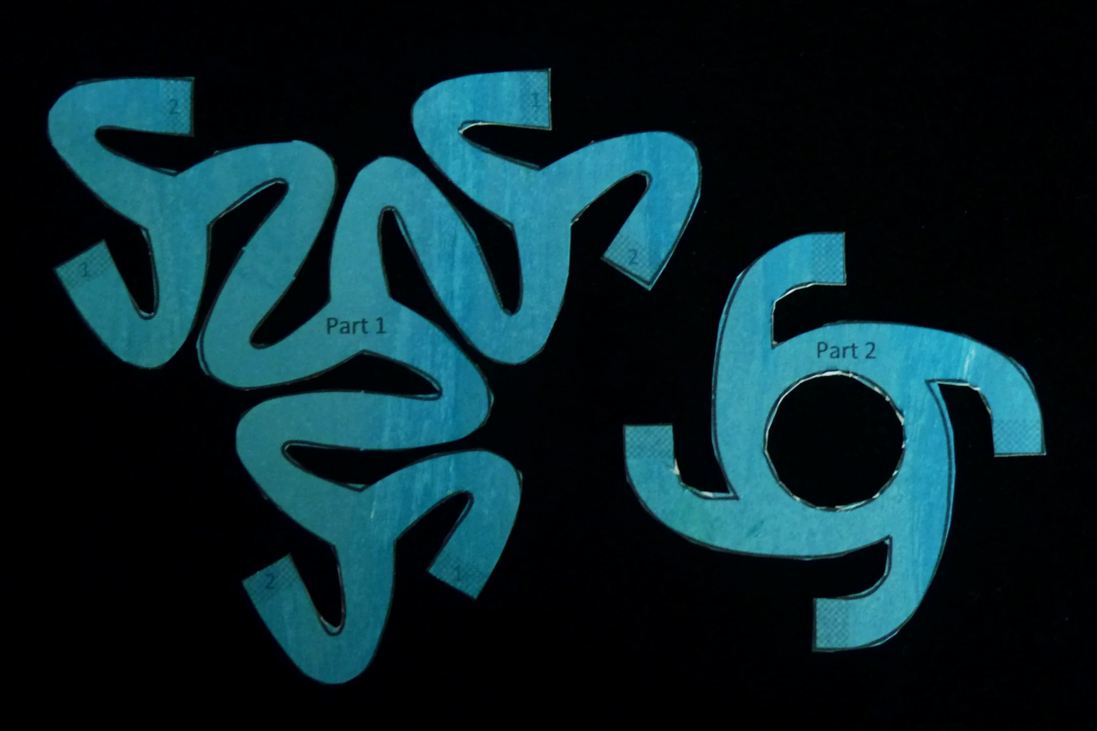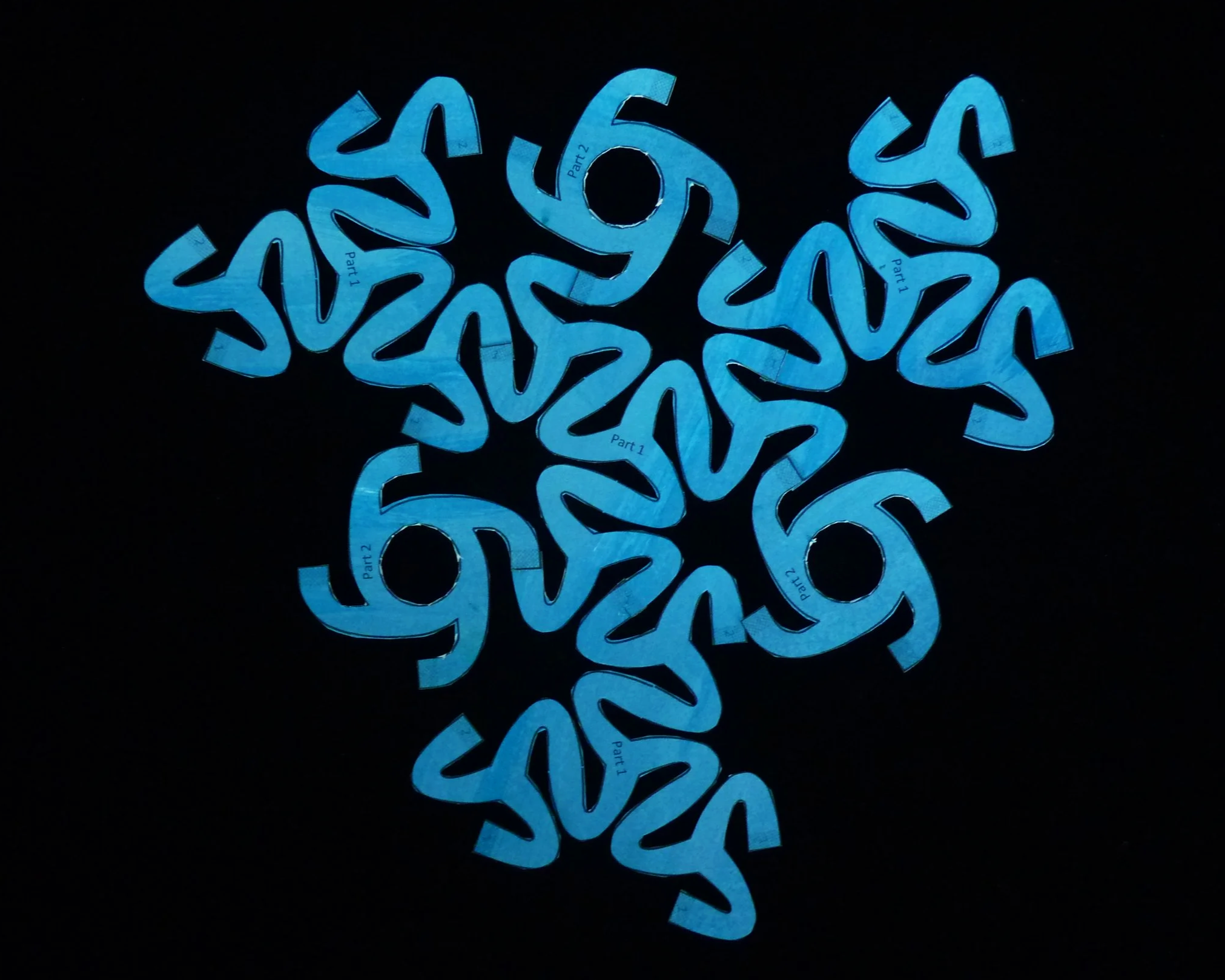 Attach a new Part 2 in each of the three gaps by overlap gluing three arms of each Part 2 with three Part 1 arms labelled with a “2”. Lastly attach the final Part 1 in the remaining gap using the six available arms and glue patches.