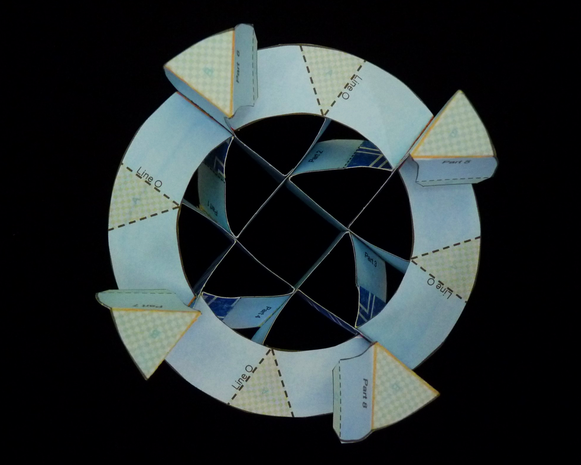 Add Parts 5, 6, 7, and 8. Glue Flap C on Part 5 at Line O on Part 2 (on the opposite side of the printing). Glue Flap C on Part 6 at Line O on Part 1 (on the opposite side of the printing). Glue Flap C on Part 7 at Line O on Part 4 (on the opposite side of the printing). Glue Flap C on Part 8 at Line O on Part 3 (on the opposite side of the printing).