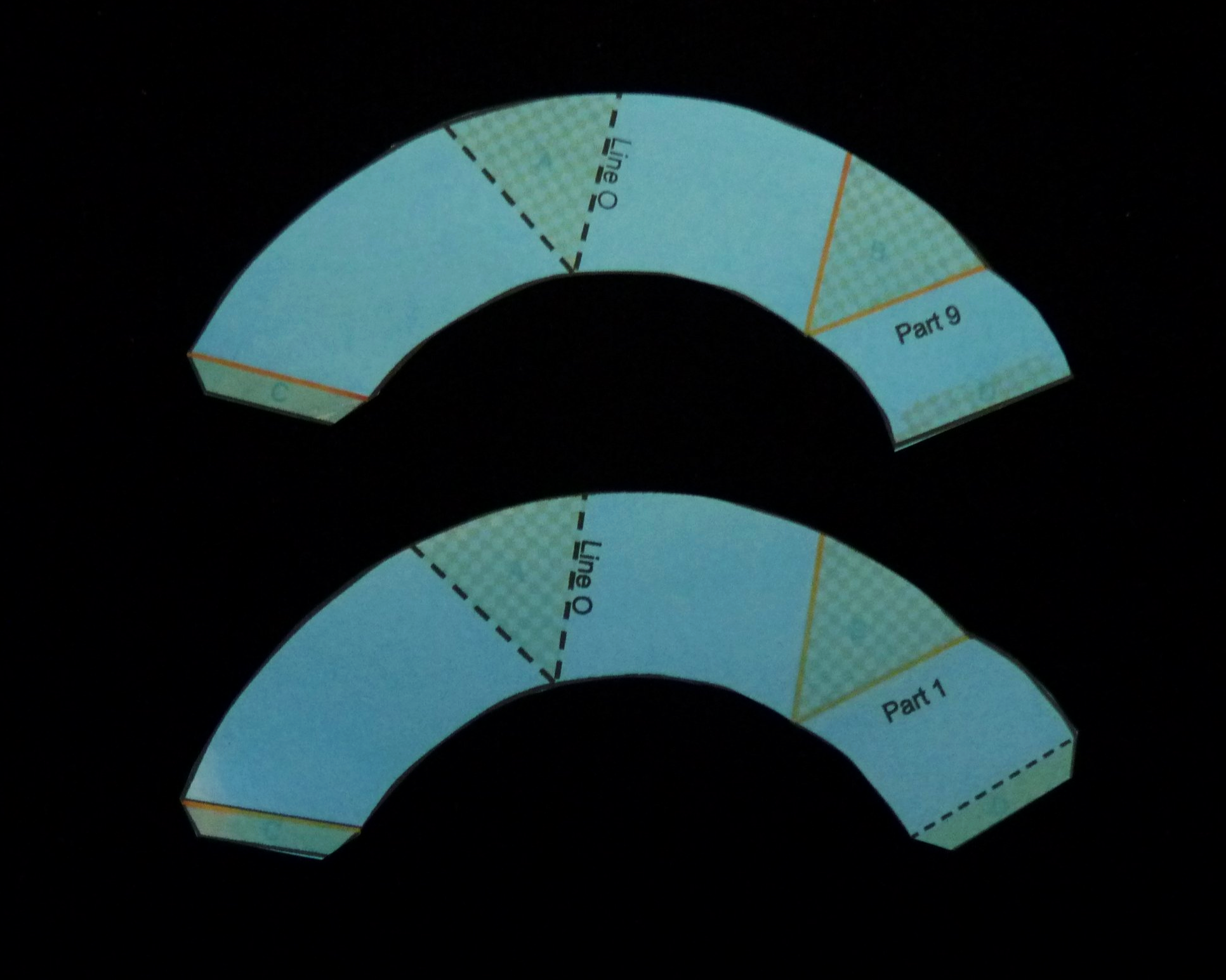 Add Parts 9, 10, 11, and 12. As in Step 5, where it says to glue at Line O, it is always on the opposite side of the paper as the printing.