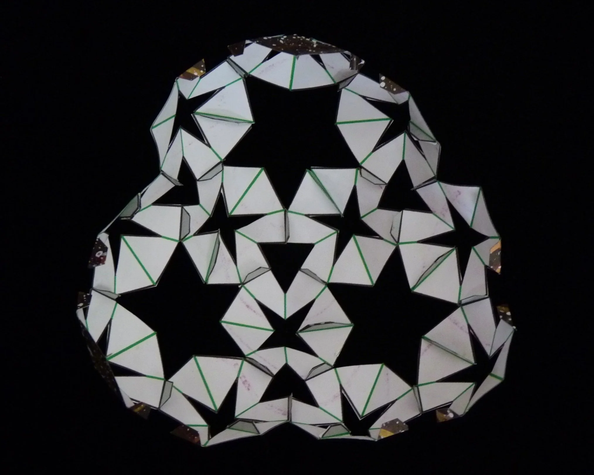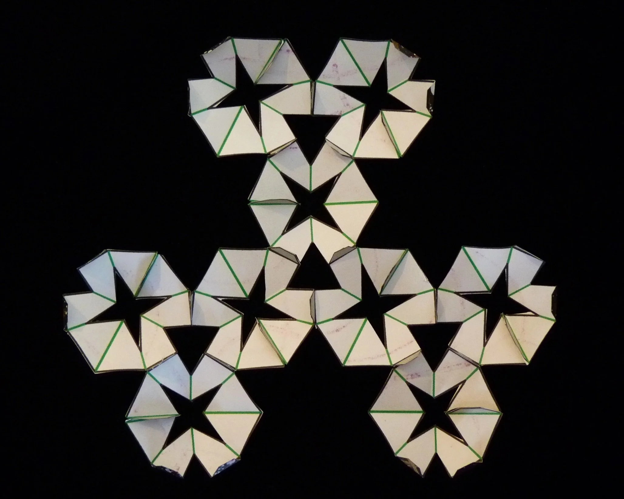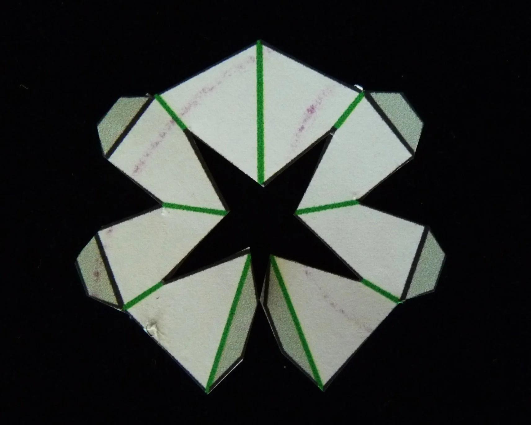 Add six more parts, each attached with two glue flaps to two adjacent flaps on the project. Adding these parts will complete six more open triangles.