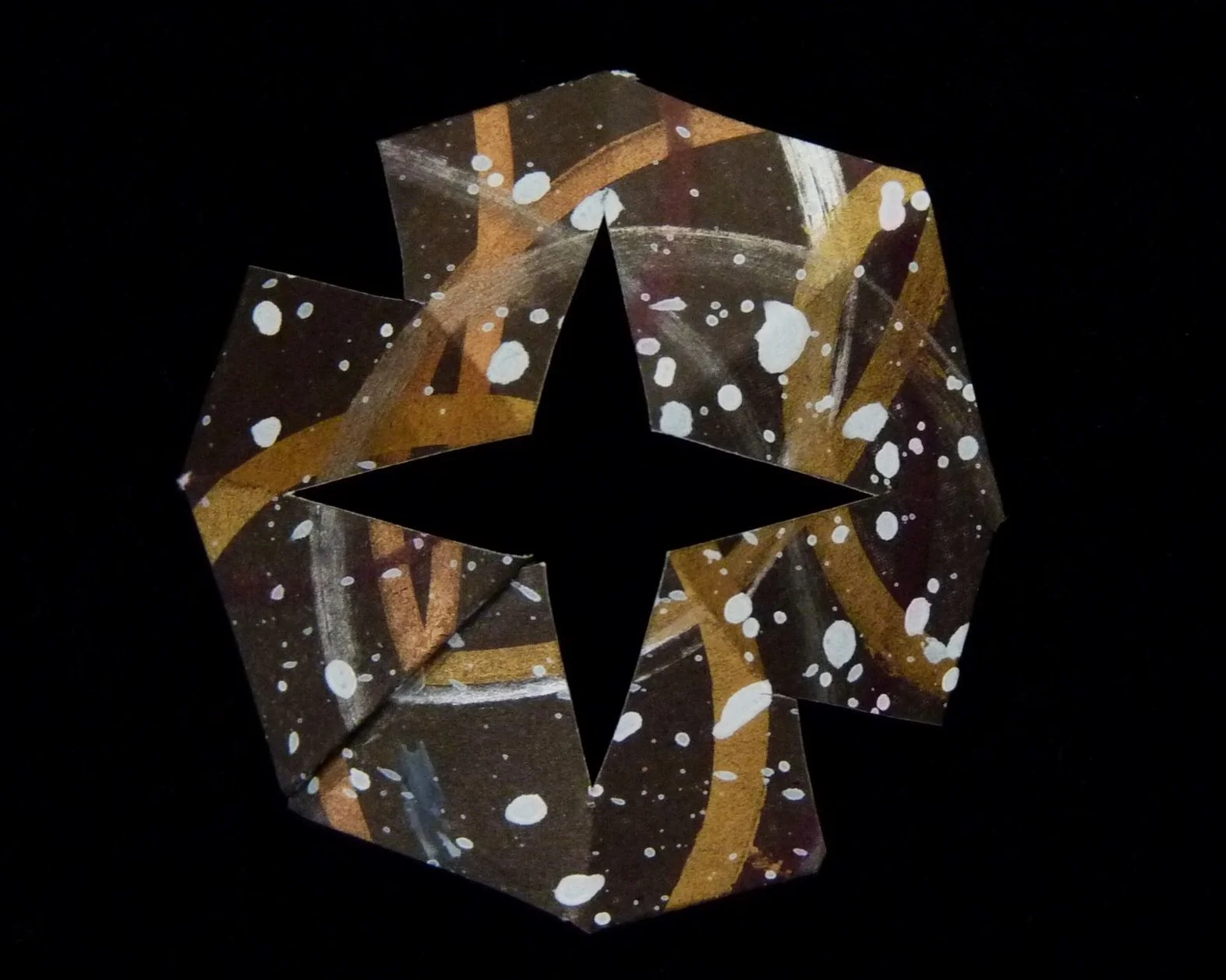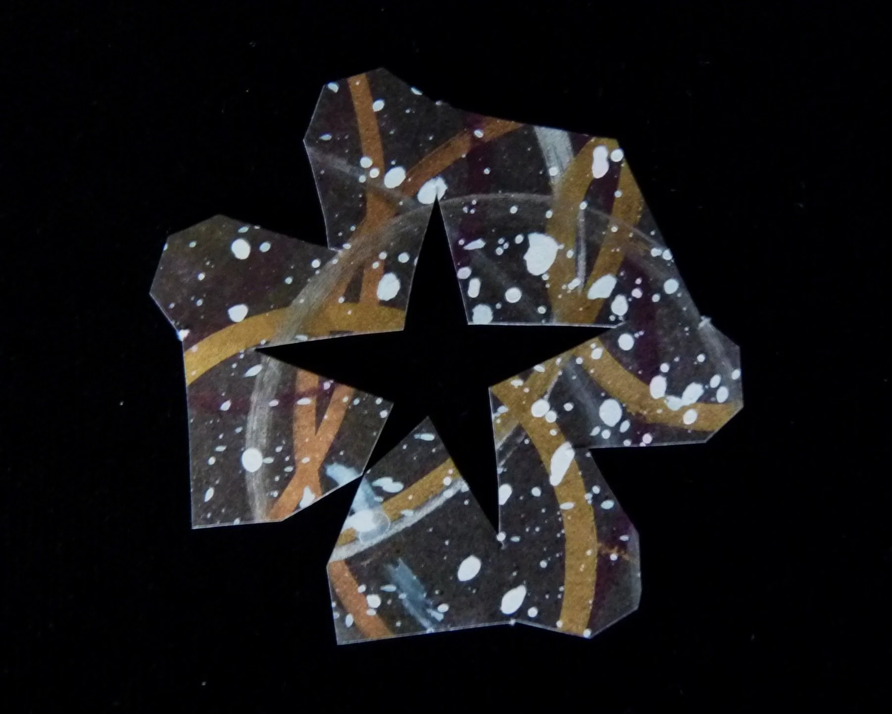 Add three more parts by connecting a new part between each pair of parts added in Step 5 using one glue flap on each side of each new part. The first three open five–pointed stars will now be formed.