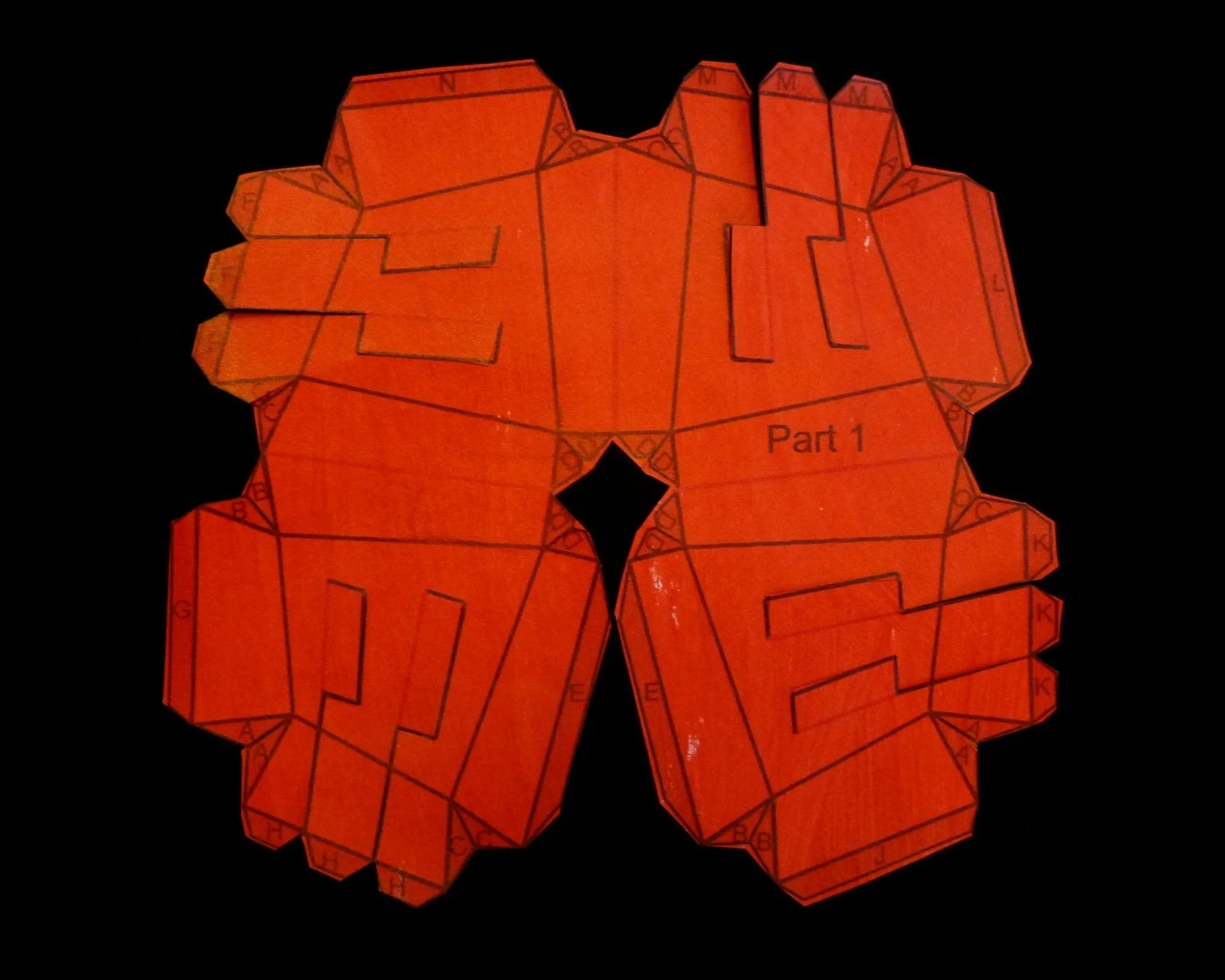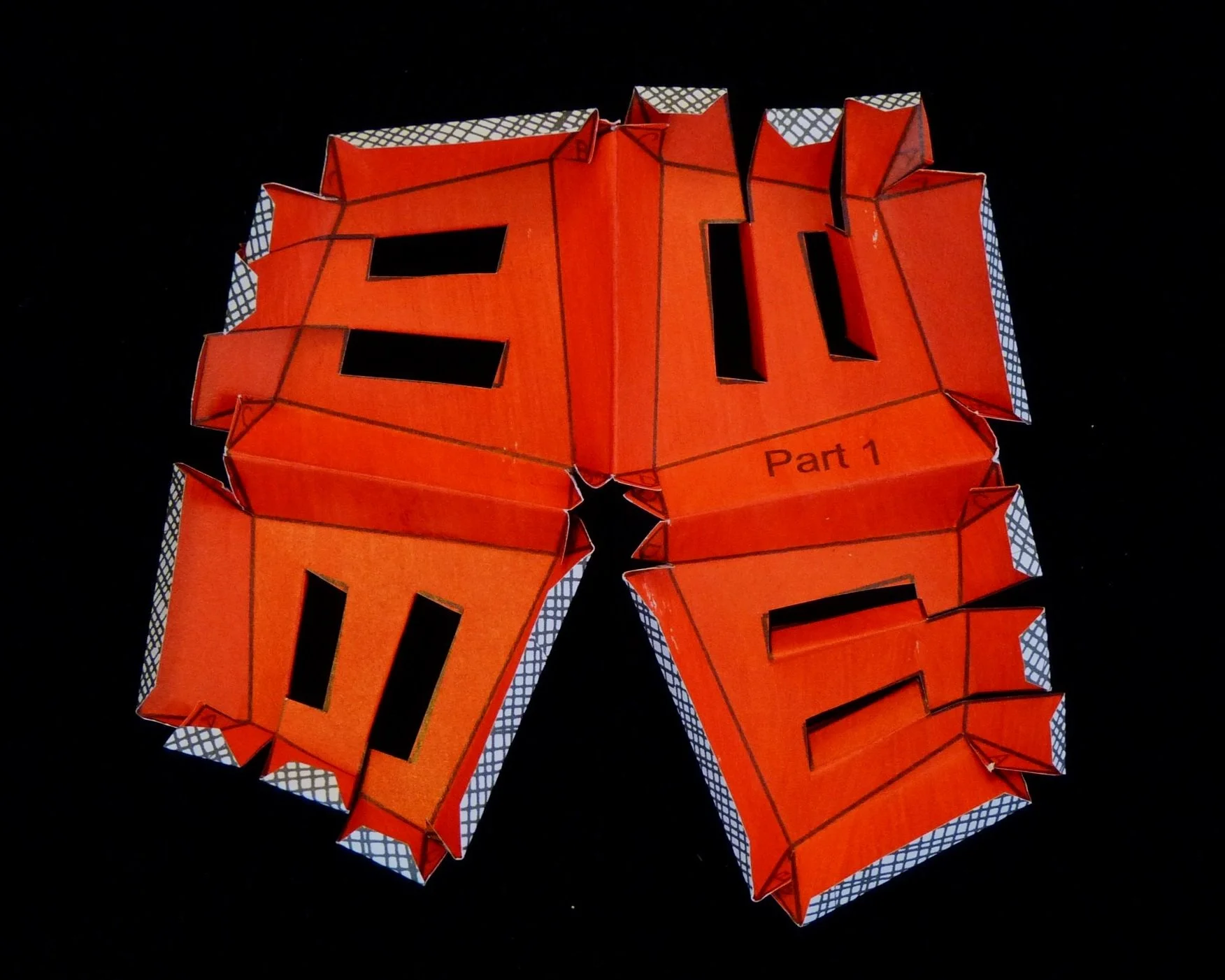 Connect Part 2 to Part 1. Glue the 3 small Flap F’s on Part 1 all to the single larger Flap F on Part 2, and glue the 3 small Flap G’s on Part 2 all to the single larger Flap G on Part 1.